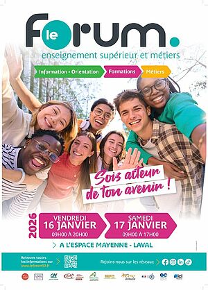 Vous êtes collégiens ou lycéens et vous êtes actuellement en recherche d’informations pour votre orientation, n’hésitez pas à vous rendre au forum des métiers et de l’enseignement supérieur les 16 et 17 janvier à l'Espace Mayenne.