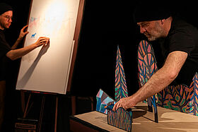 Dans un atelier de fabrique d’histoires, deux comédiens : l’un dessine, l’autre anime les personnages. Nous découvrons les aventures d’un ours, piégé dans une usine qui a poussé au-dessus de sa caverne…