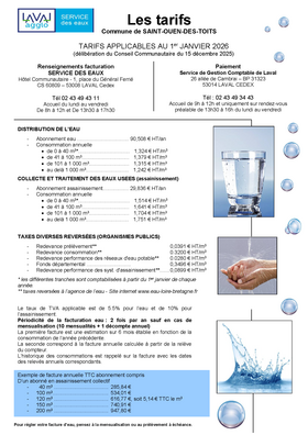 Saint-Ouën-des-Toits Saint-Ouën-des-Toits 1 Documents - Publié le mardi 20 janvier 2026 Formulaire_tarifs_eau_2026_Saint_Ouen_des_Toits.pdf (393Ko) Télécharger PrécédentRetour à la listeSuivant